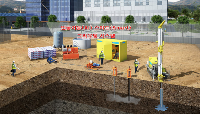 AI(인공지능)형 Smart Grouting System(AiGS)을 이용하여 시공 전 주수시험을 실시하고 주입 중 AI(인공지능)기술을 이용하여 실시간 주입유형을 분석하여 문제점등에 대하여 조치시공이 가능하고 시추조사와 매칭한 P~Q 주상도 제공하고 현장 CCTV 확인 및 스마트원격관리가 가능한 공법