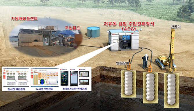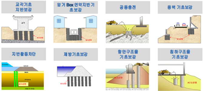 ACG공법은 비유동성의 몰탈형 주입재를 지중에 압입하여 기둥형상의 고결체를 형성함과 동시에 주변지반을 압축강화시키는 지반개량공법임.